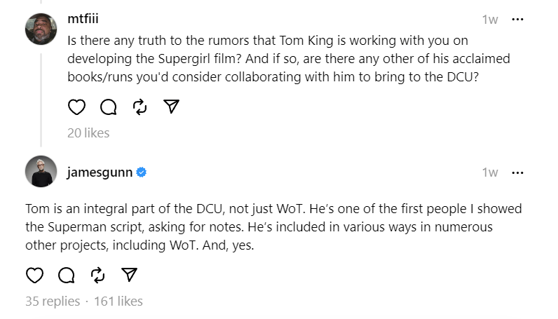 Gunn noted on Threads, “Tom is an integral part of the DCU, not just WoT. He’s one of the first people I showed the Superman script, asking for notes. He’s included in various ways in numerous other projects, including WoT. And, yes.”