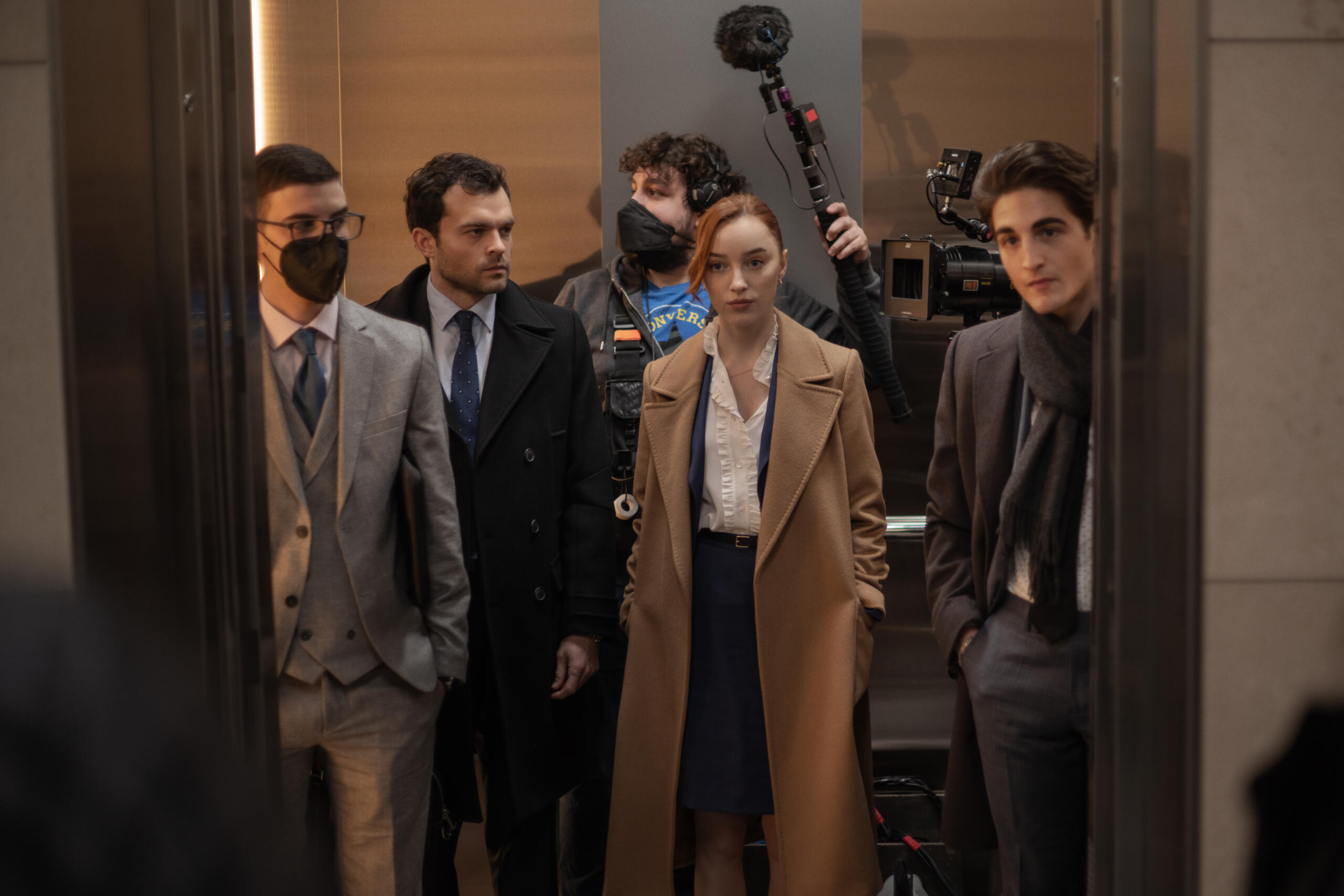 Fair Play, behind the scenes L to R: Alden Ehrenreich as Luke, Phoebe Dynevor as Emily Brandon Bassir as Dax. Cr. Sergej Radovic / Courtesy of Netflix