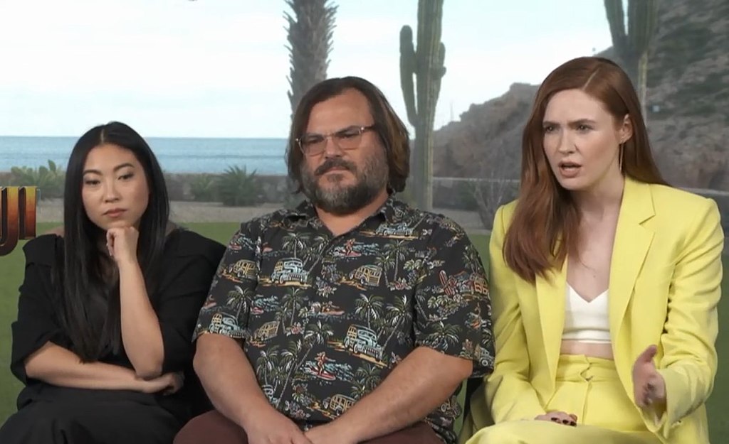 Awkwafina, Jack Black & Karen Gillan in interview for Jumanji: The Next Level in 2019. Photo Credit: QUE TAL UM CINEMINHA?, CC BY 3.0 <https://creativecommons.org/licenses/by/3.0>, via Wikimedia Commons