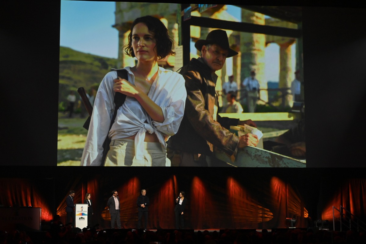 LONDON, ENGLAND – APRIL 07: Phoebe Waller-Bridge and Harrison Ford on a screen during the Indiana Jones and the Dial of Destiny presentation during the studio panel at Star Wars Celebration 2023 in London at ExCel on April 07, 2023 in London, England. (Photo by Kate Green/Getty Images for Disney)