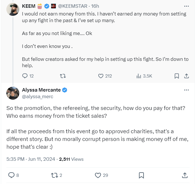 Keemstar posted, “Dear Alyssa Mercante and Vara Dark! HappyPunch will help you set up your fight!” Mercante promptly replied, “Not giving you any money, thanks!”