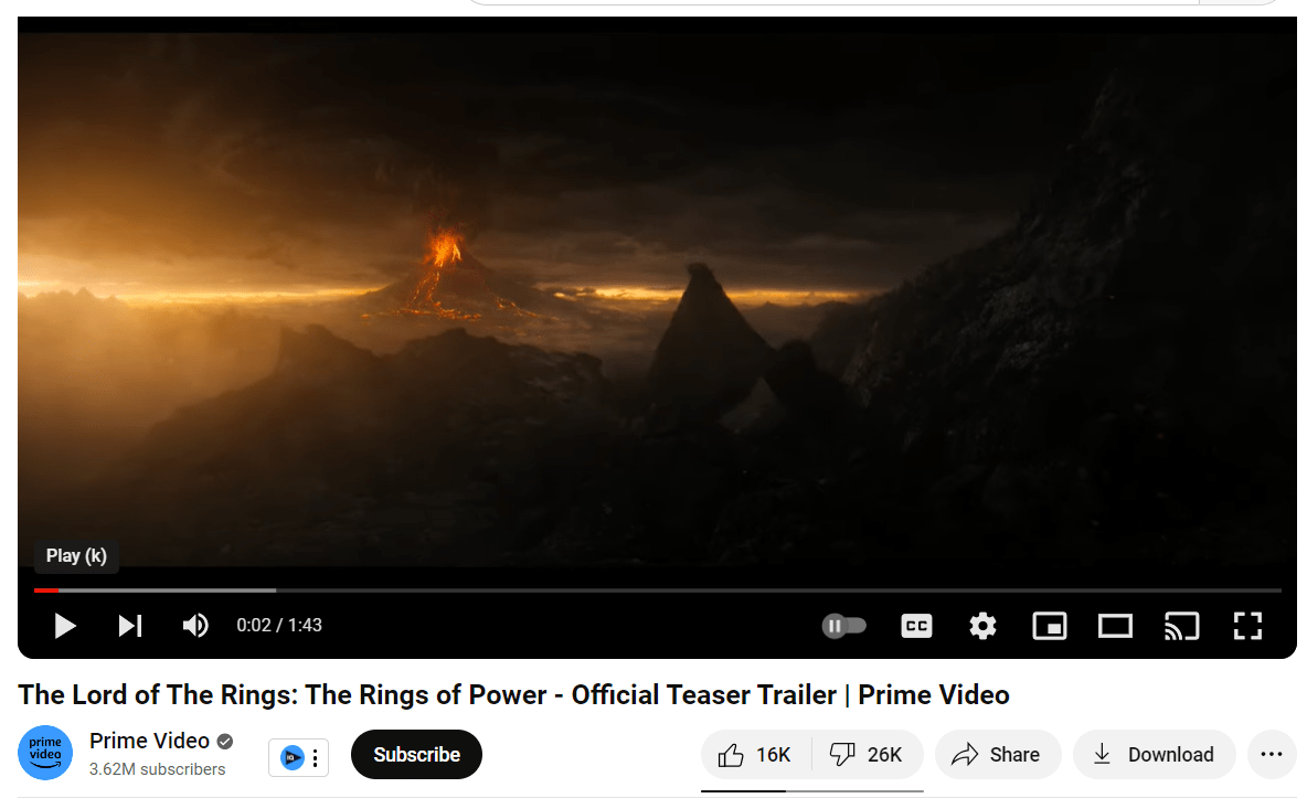 Screenshot of The Lord of the Rings: The Rings of Power teaser trailer showing like to dislike ratio.