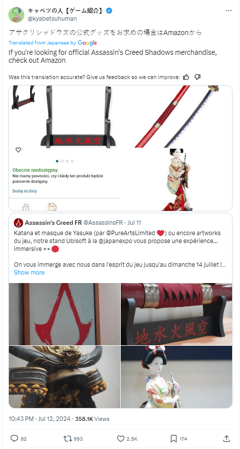 The company was accused by X user kyabetsuhuman of grabbing the products off of Amazon. A translation from DeepL reads, “Official Assassin’s Creed Shadows merchandise is available from Amazon.