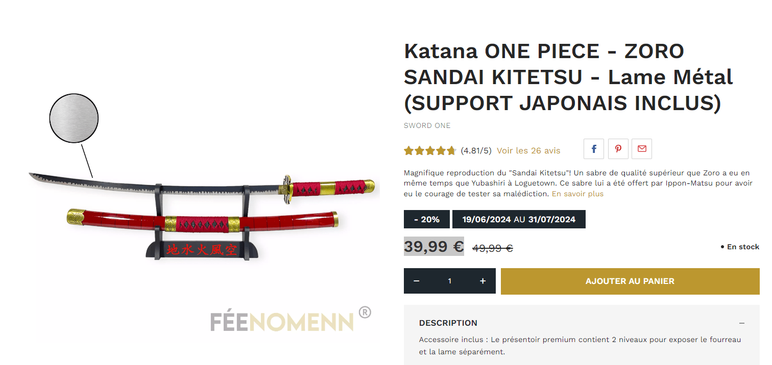 Both the katana and the stand are sold by a French company called Féenomen that sells a reproduction of Zoro’s Sandai Kitetsu. The katana and stand are listed on the company’s website for 39,99 €.