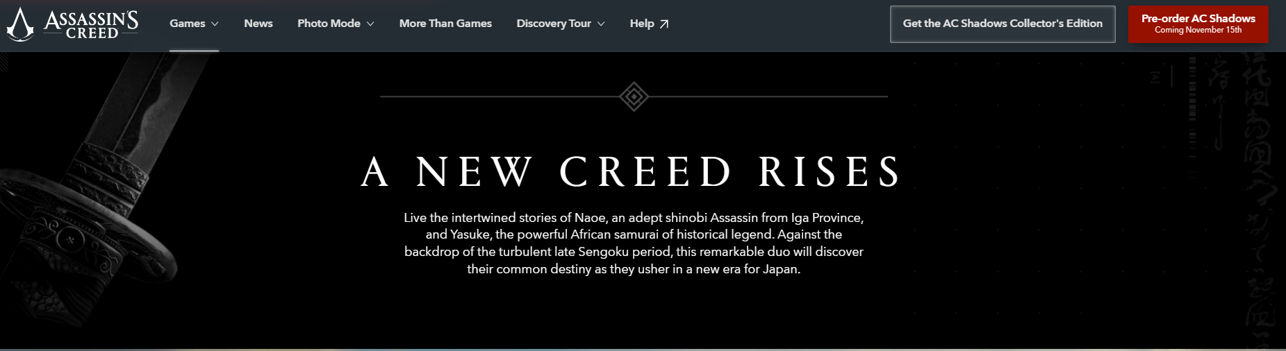 Screenshot of the Assassin’s Creed Shadows website describing Yasuke as an “African samurai of historical legend.”