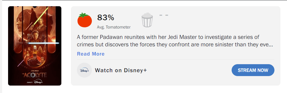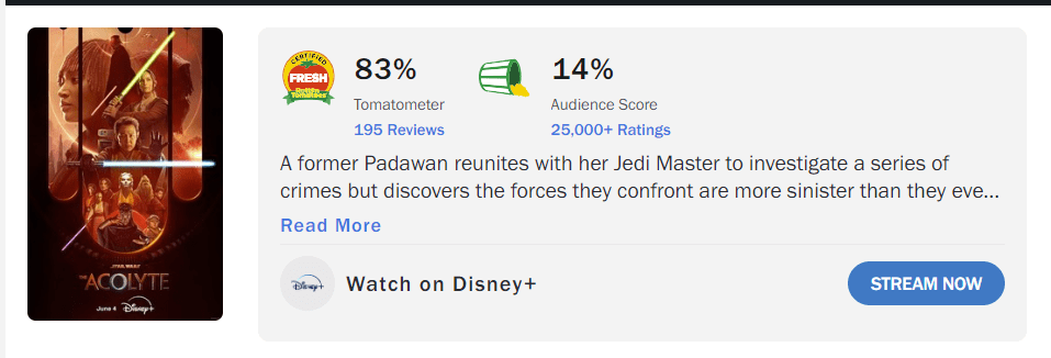 When searching for The Acolyte on Rotten Tomatoes, people no longer see the Audience Score, but instead only see the Tomatometer score, which shows the critics score.