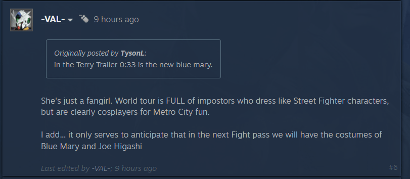 Another added, “She’s just a fangirl. World tour is FULL of impostors who dress like Street Fighter characters, but are clearly cosplayers for Metro City fun. I add… it only serves to anticipate that in the next Fight pass we will have the costumes of Blue Mary and Joe Higashi.”