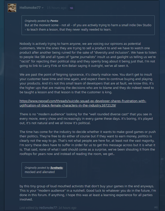 Steam user Hellsmoke77 puts it succinctly, “Nobody is actively trying to harm anyone, we are voicing our opinions as potential customers. We’re the ones they are trying to sell a product to and we have to watch one product after another being ruined for the sake of ‘diversity and inclusion’. We have to listen to people like SBI and all types of ‘game journalists’ insult us and gaslight us” for “rejecting their political slop and they openly brag about it being just that. I’m not going to link to Larry Fink or Kim Belair saying it outright, we’ve all seen it.”