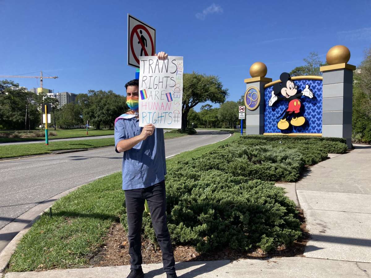 The lone protester who showed up on the “Disney Walkout Day” at Walt Disney World.
