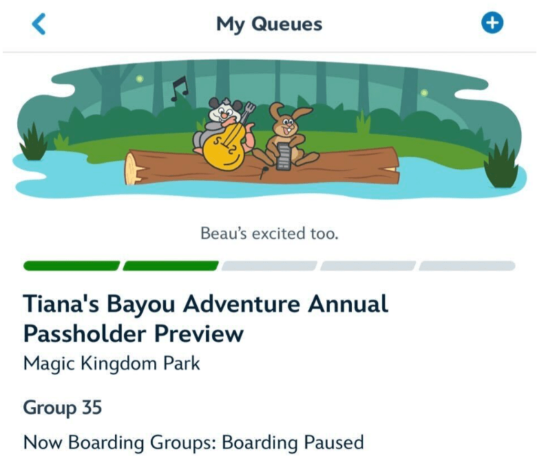 When Tiana’s Bayou Adventure breaks down, the virtual queue now says “Boarding Paused’. This lets Passholders know that the boarding group process has stopped. — Mickey Blog