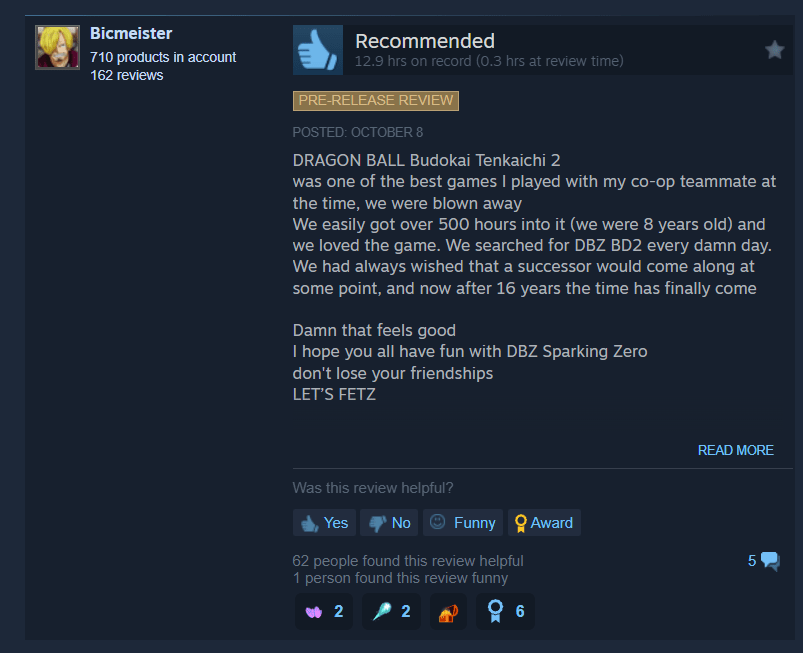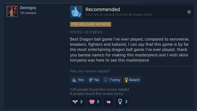 Demigra wrote, “Best Dragon ball game I’ve ever played, compared to xenoverse, breakers, fighterz and kakarot, I can say that this game is by far the most entertaining dragon ball game I’ve ever played. thank you bandai namco for making this masterpiece and I wish akira toriyama was here to see this masterpiece”