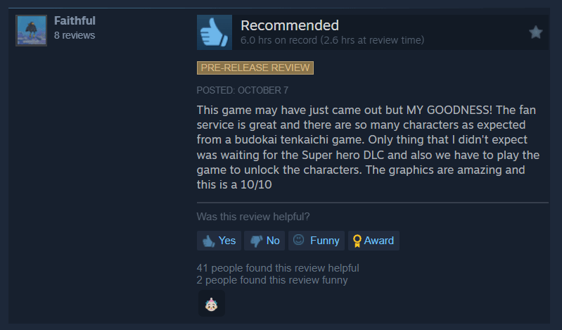 Faithful praised, “This game may have just came out but MY GOODNESS! The fan service is great and there are so many characters as expected from a budokai tenkaichi game. Only thing that I didn’t expect was waiting for the Super hero DLC and also we have to play the game to unlock the characters. The graphics are amazing and this is a 10/10.”
