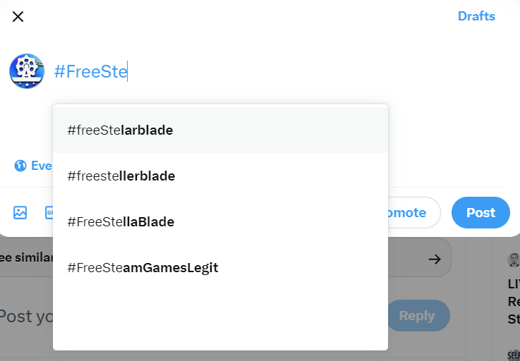 In fact, when attempting to post the hashtag, only misspelled versions of the hashtag populate such as #freestelarblade and #freestellerblade and #FreeStellaBlade.
