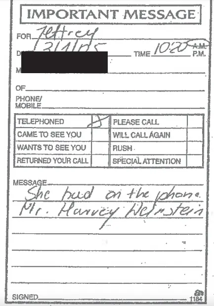The note read, “She had on the phone, Mr. Harvey Weinstein.”