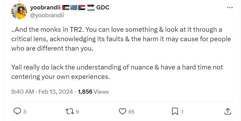 She added, “..And the monks in TR2. You can love something & look at it through a critical lens, acknowledging its faults & the harm it may cause for people who are different than you. Yall really do lack the understanding of nuance & have a hard time not centering your own experiences.”