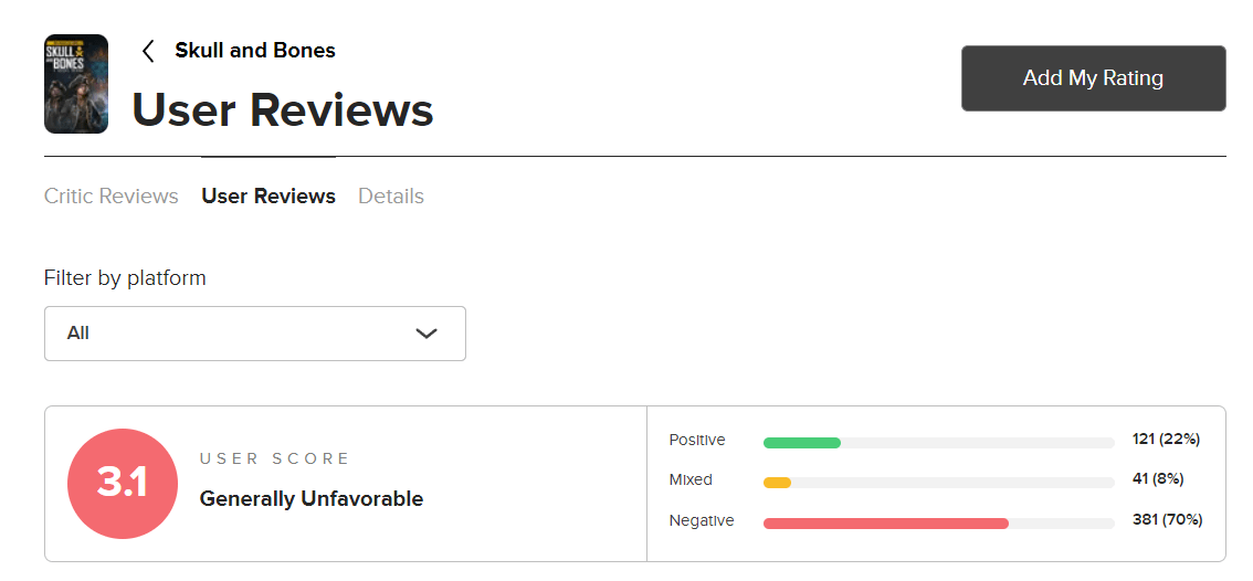 Skull and Bones released on February 16th and the game has received an abysmal 3.1 on Metacritic’s User Score from over 530 reviews.