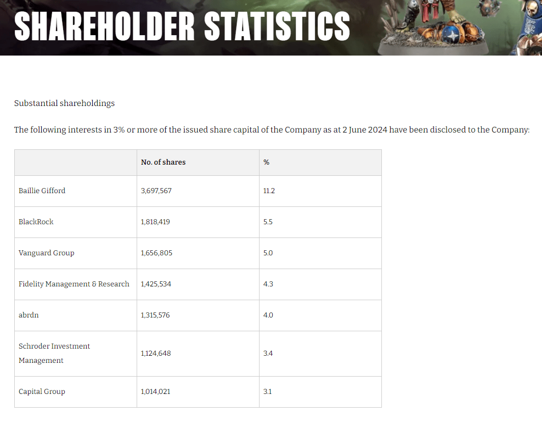 Furthermore, it’s been revealed that Games Workshop is a converged company with investment firms BlackRock and Vanguard owning more than 10% of the company.