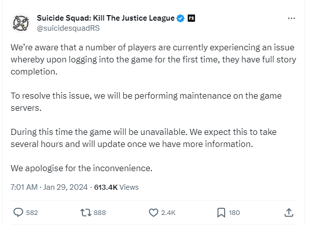 Rocksteady addressed the bug, posting on X, “We’re aware that a number of players are currently experiencing an issue whereby upon logging into the game for the first time, they have full story completion. To resolve this issue, we will be performing maintenance on the game servers. During this time the game will be unavailable. We expect this to take several hours and will update once we have more information. We apologise for the inconvenience.”