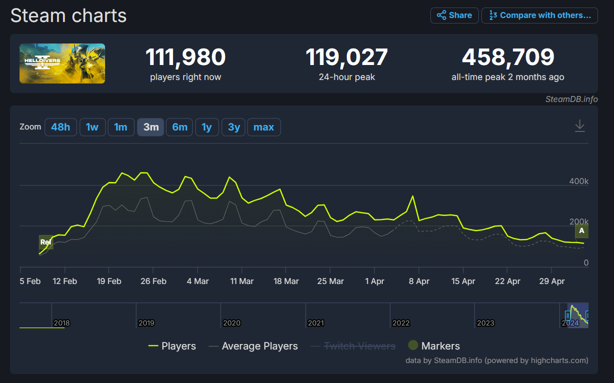Nevertheless, negative feedback has been piling up and the player base has been dwindling. Steam DB reports peak concurrent players today has only reached 115,130 players down from 119,027 from May 3rd and 119,571 players on May 2nd.
