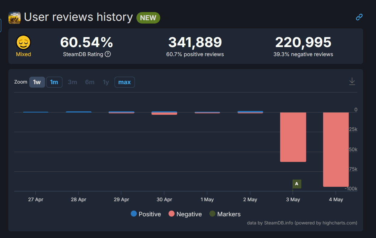 On top of the player base dwindling, the game’s Steam reviews have been overwhelmingly negative over the last couple of days. On May 3rd, the game received 62,477 negative reviews and only 252 positive reviews.