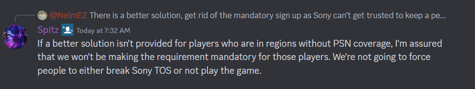In a follow-up post, Spitz wrote, “If a better solution isn’t provided for players who are in regions without PSN coverage, I’m assured that we won’t be making the requirement mandatory for those players. We’re not going to force people to either break Sony TOS or not play the game.”