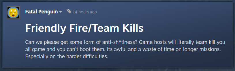 Another user, Fatal Penguin posted, “Can we please get some form of anti-sh*tiness? Game hosts will literally team kill you all game and you can’t boot them. Its awful and a waste of time on longer missions. Especially on the harder difficulties.”