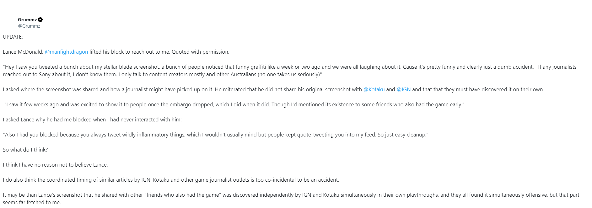 At the time of this posting, Kern wrote, “I think I have no reason not to believe Lance. I do also think the coordinated timing of similar articles by IGN, Kotaku and other game journalist outlets is too co-incidental to be an accident.”