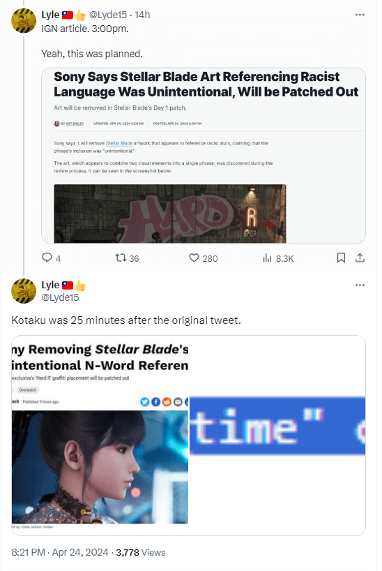 He reiterated his suspicions that IGN and Kotaku coordinated in a subsequent post in response to Lyde15’s original thread, “Stellar Blade ‘Hard R’ controversy was MANUFACTURED as a coordinated attack? IGN and Kotaku respond ready with articles, including Sony official responses exactly the moment the screen shot was posted by YouTuber Lance McDonald. Impossible for news to get comment and response from Sony in such short time. This had to have been collusion designed to be posted instant embargo lifted to create fake news and controversy.”