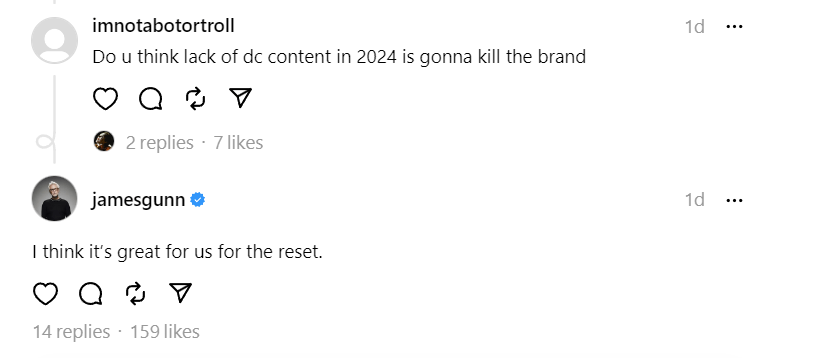 Gunn shared his thoughts on Threads when a user asked, “Do u think lack of dc content is 2024 is gonna kill the brand?”