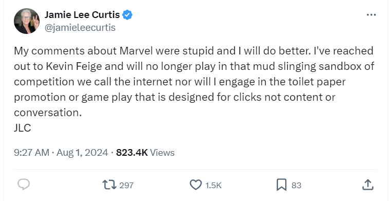 Curtis has since retracted her comments after allegedly speaking with Marvel Studios boss Kevin Feige. She posted to X, “My comments about Marvel were stupid and I will do better. I’ve reached out to Kevin Feige and will no longer play in that mud slinging sandbox of competition we call the internet nor will I engage in the toilet paper promotion or game play that is designed for clicks not content or conversation.”