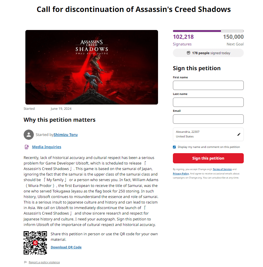 Screenshot of a petition calling for the shut down of Assassin’s Creed Shadows on Change.org