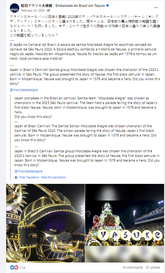 Brazilian Embassy in Japan’s post about Yasuke on Facebook