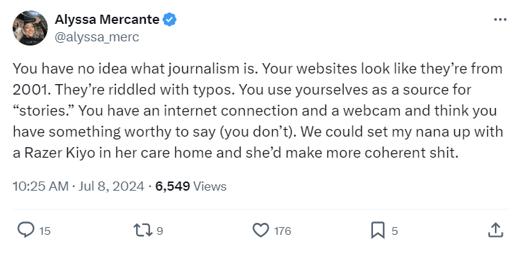 Following this thread, Mercante then lashed out writing, “You have no idea what journalism is. Your websites look like they’re from 2001. They’re riddled with typos. You use yourselves as a source for ‘stories.’ You have an internet connection and a webcam and think you have something worthy to say (you don’t). We could set my nana up with a Razer Kiyo in her care home and she’d make more coherent shit.”