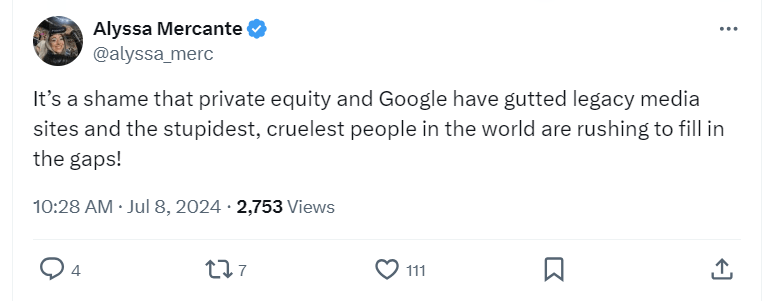 She added in a subsequent post, “It’s a shame that private equity and Google have gutted legacy media sites and the stupidest, cruelest people in the world are rushing to fill in the gaps!”