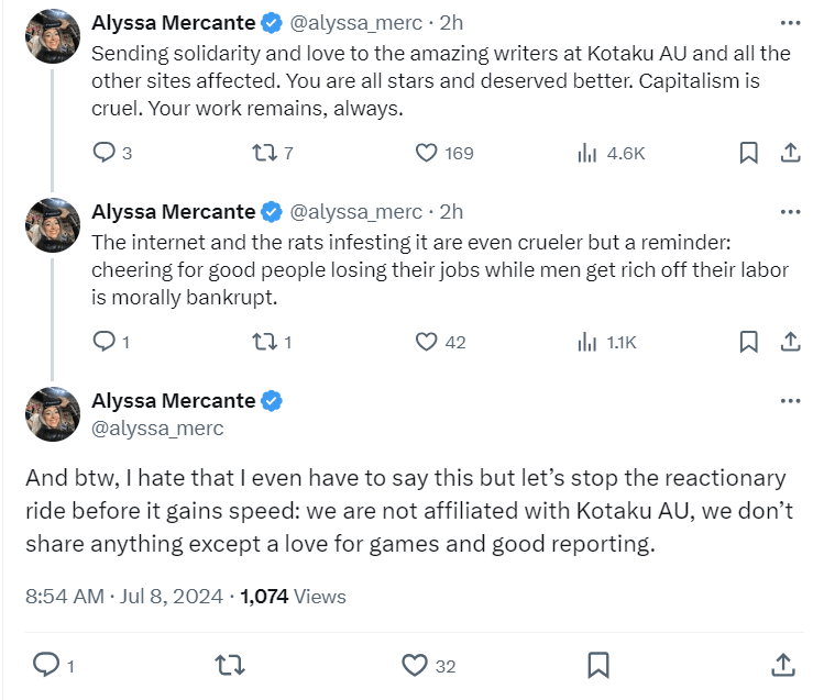 Mercante reacted to the news in a couple of threads posted to X. First, she wrote, “Sending solidarity and love to the amazing writers at Kotaku AU and all the other sites affected. You are all stars and deserved better. Capitalism is cruel. Your work remains, always.”