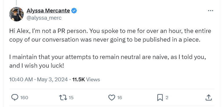 Mercante responded to this post and these DMs writing, “Hi Alex, I’m not a PR person. You spoke to me for over an hour, the entire copy of our conversation was never going to be published in a piece. I maintain that your attempts to remain neutral are naive, as I told you, and I wish you luck!”
