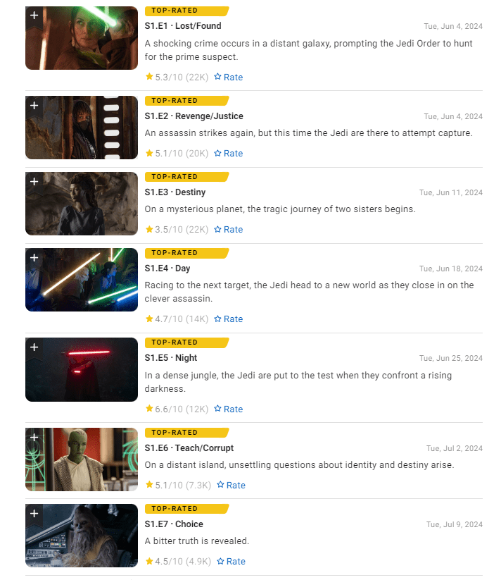There is one big caveat. Ahsoka’s two episodes had a total runtime of 101 minutes compared to The Acolyte’s 82 minutes. However, even if you use Disney’s simple total minutes viewed divided by total run time, Ahsoka’s viewership comes out to 8.2 million views compared to The Acolyte’s 5.4 million. That’s a 34% decline.