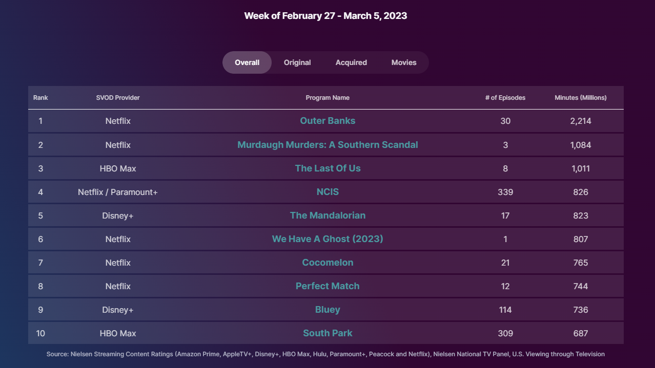 Nielsen “Overall” Streaming Ratings for Week of February 27 to March 5, 2023