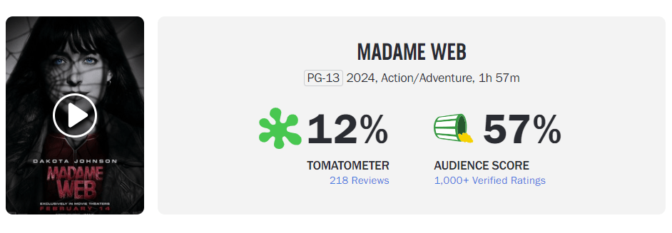 According to The-Numbers, Madame Web only grossed $6 million in its second weekend a 61% decline from its opening weekend, which brought in $15.3 million.