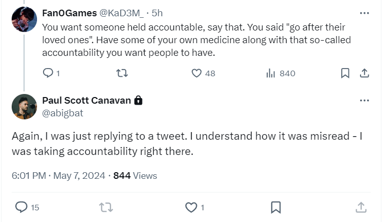 Kern reacted to Canavan’s comments and Mercante’s actions writing on X that Kotaku and more will come after gamers, but “meanwhile they want to find your families and ‘string them up.'”