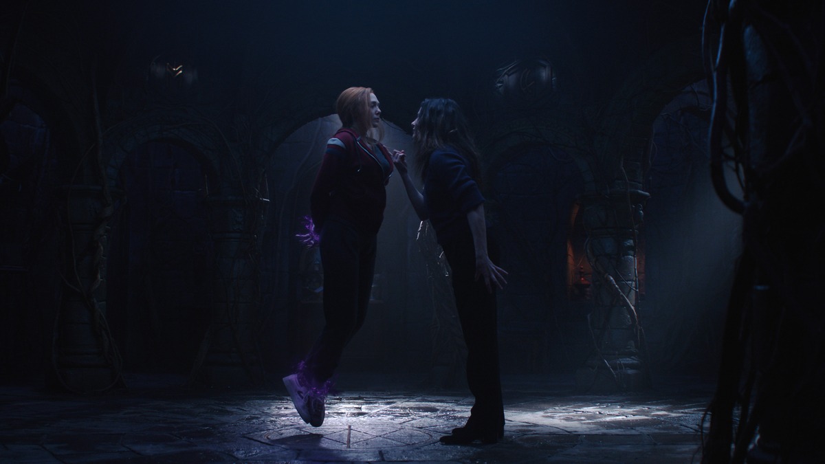 (L-R): Elizabeth Olsen as Wanda Maximoff and Kathryn Hahn as Agatha Harkness in Marvel Studios’ WANDAVISION exclusively on Disney+. Photo courtesy of Marvel Studios. ©Marvel Studios 2021. All Rights Reserved.