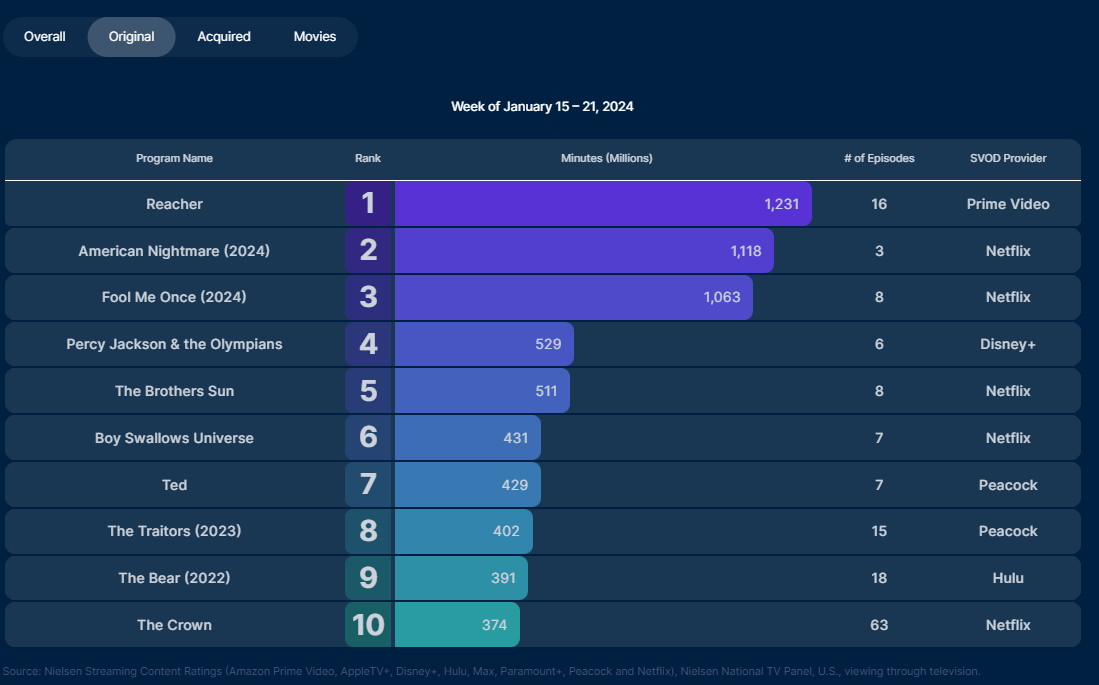 Top 10 Nielsen Original programs for the week of January 15th to January 21st, 2024