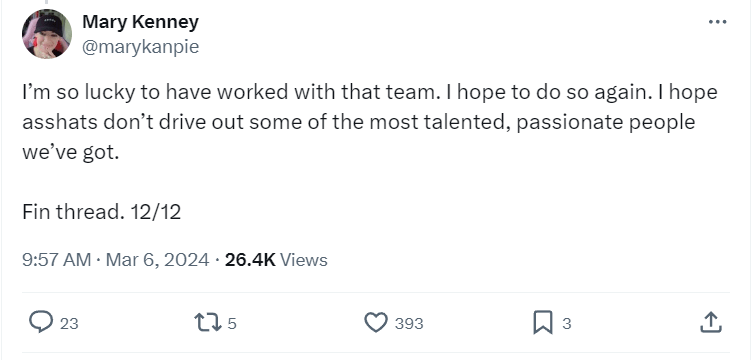 Kenney concluded her thread, “I’m so lucky to have worked with that team. I hope to do so again. I hope asshats don’t drive out some of the most talented, passionate people we’ve got.”