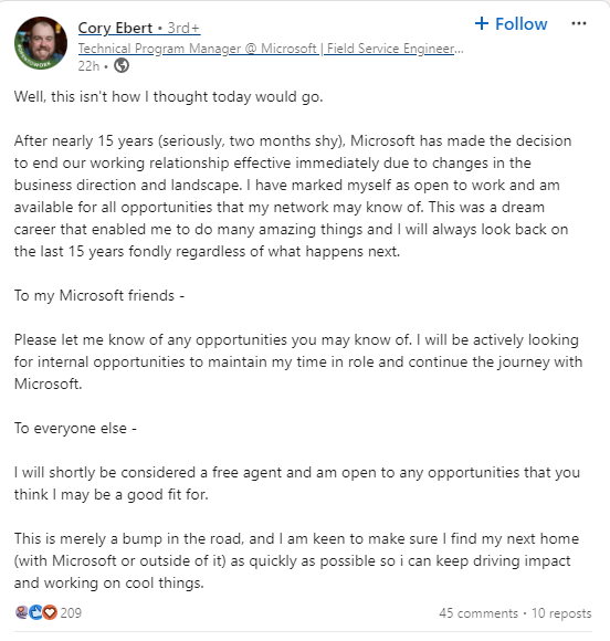 Cory Ebert, a Technical Program Manager, announced on LinkedIn, “Well, this isn’t how I thought today would go. After nearly 15 years (seriously, two months shy), Microsoft has made the decision to end our working relationship effective immediately due to changes in the business direction and landscape. I have marked myself as open to work and am available for all opportunities that my network may know of. This was a dream career that enabled me to do many amazing things and I will always look back on the last 15 years fondly regardless of what happens next.”