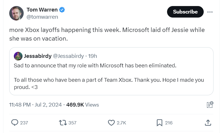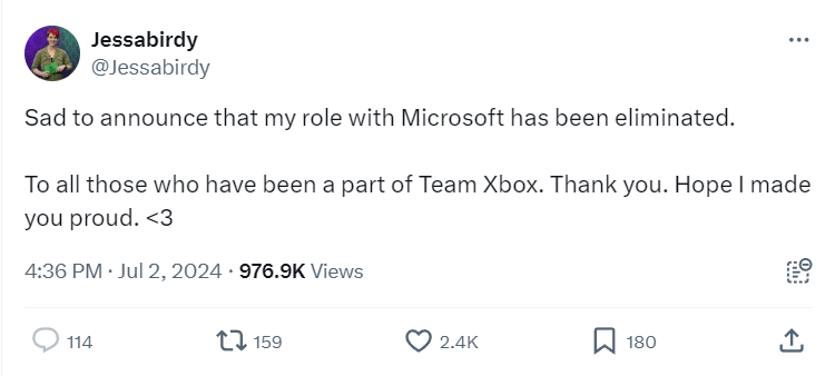X user Jessabirdy announced she had been laid off writing, “Sad to announce that my role with Microsoft has been eliminated. To all those who have been a part of Team Xbox. Thank you. Hope I made you proud. <3”