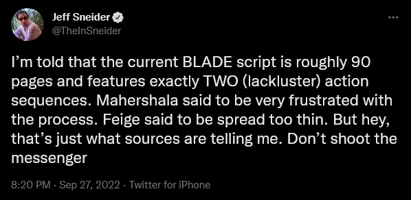 In September 2022, scooper Jeff Sneider claimed, “I’m told that the current BLADE script is roughly 90 pages and features exactly TWO (lackluster) action sequences.”