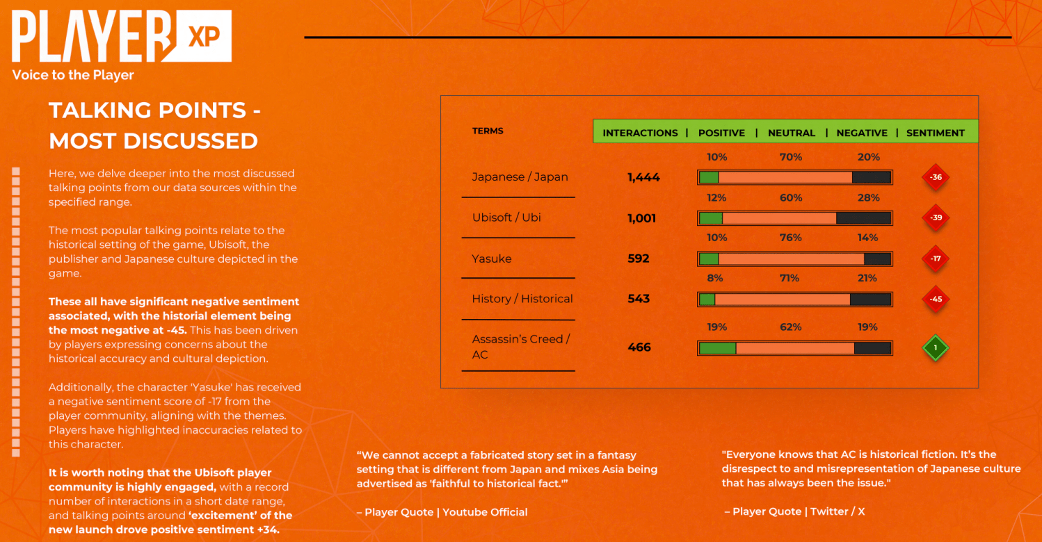 “It is worth noting that the Ubisoft player community is highly engaged, with a record number of interactions in a short date range, and talking points around ‘excitement’ of the new launch drove positive sentiment +34,” PlayerXP shared.