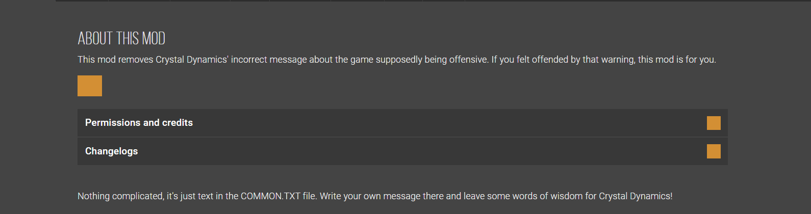 A mod that was uploaded to Nexus Mods on February 15th by Pyke removed the trigger warning. The brief description of the mod stated, “This mod removes Crystal Dynamics’ incorrect message about the game supposedly being offensive. If you felt offended by that warning, this mod is for you.”
