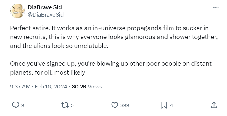 Another wrote, “Perfect satire. It works as an in-universe propaganda film to sucker in new recruits, this is why everyone looks glamorous and shower together, and the aliens look so unrelatable. Once you’ve signed up, you’re blowing up other poor people on distant planets, for oil, most likely.”