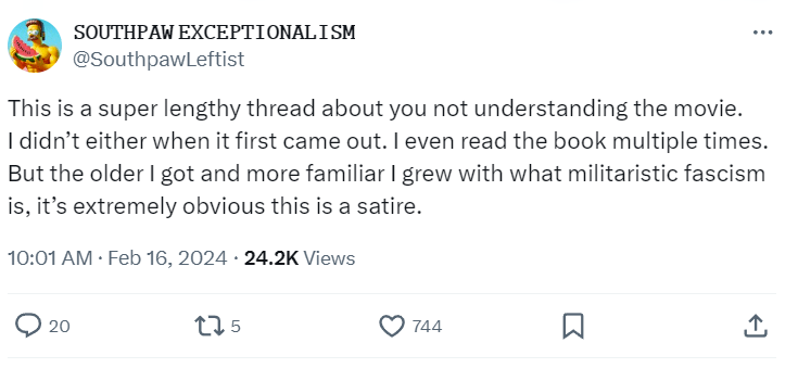 Another responded, “This is a super lengthy thread about you not understanding the movie. I didn’t either when it first came out. I even read the book multiple times. But the older I got and more familiar I grew with what militaristic fascism is, it’s extremely obvious this is a satire.”